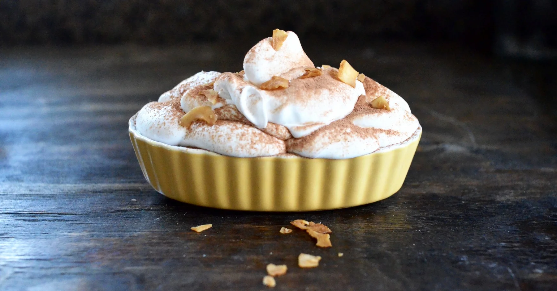 4. Prior to serving pie, spoon coconut cream over the top and garnish with coconut flakes and cocoa powder.